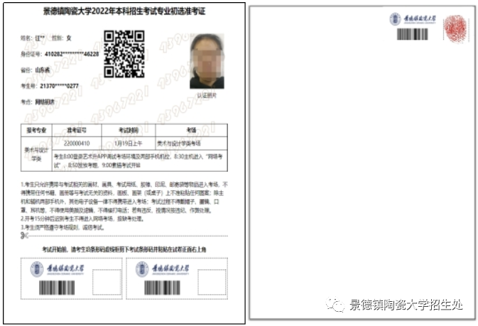 六、其他事项1、考生可于2023年1月7日上午10时登录网上报考系统查询具体考试场次、时间。2、考生可于2023年1月8日上午10时后自行采用电脑端登录我校报名系统(https://user.artstudent.cn/login/10408.htm)打印「景德镇陶瓷大学2023年本科招生考试专业初选准考证」和邮寄信息单。考生凭「景德镇陶瓷大学2023年本科招生考试专业初选准考证」和第二代居民身份证原件参加考试。