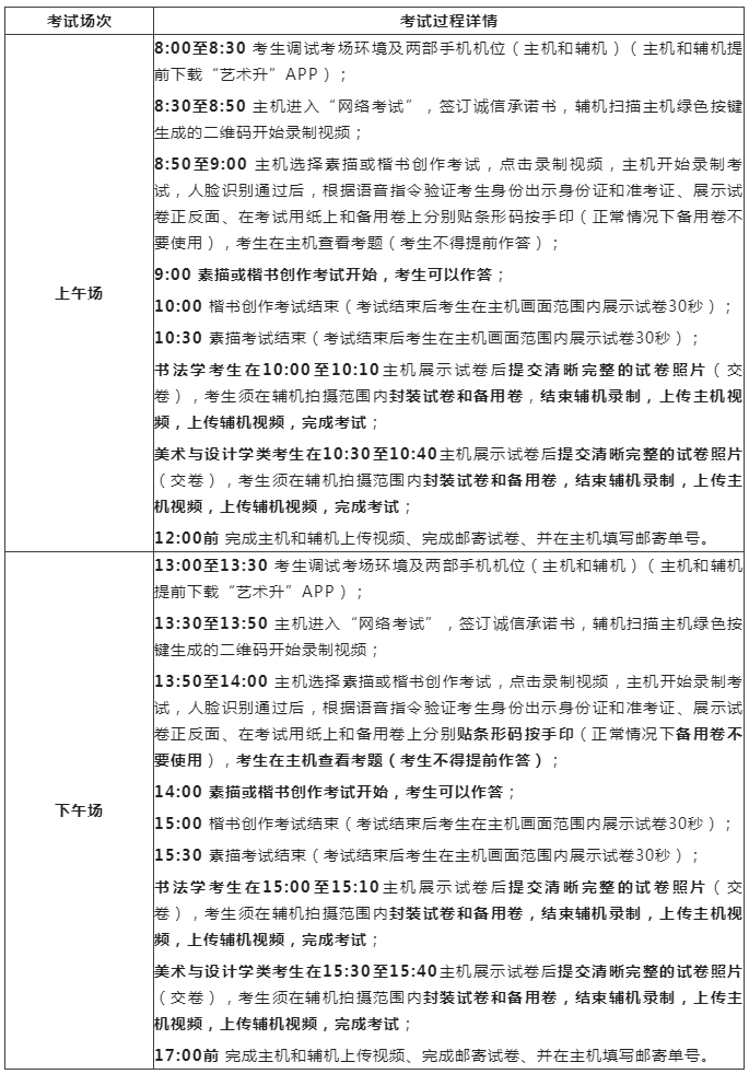 一、考场规则1、考生自觉遵守国家及有关部门制定的相关法规及规定,诚信考试。2、考生提前30分钟进入网络考场,按照要求摆放双机位(主机和辅机)。3、考生只允许携带与考试相关的画材、画具、考试用纸、邮寄袋等物品进入考场,不得携带任何书籍、画册等与考试无关的资料,画板、画架(或桌子)上不准粘贴任何图案;除主机和辅机两部手机外,其他电子设备一律不得携带进入考场;考试过程不得戴帽子、墨镜、口罩、耳机等,不得使用美颜及滤镜,不得接打电话;若有违反,视情按违纪、作弊处理。4、考试前务必移除两部手机的SIM卡,确保没有通话功能,关闭分屏、录屏、外放音乐、闹钟等其他应用程序,避免外界干扰。5、素描或楷书创作开考15分钟后迟到考生不得进入网络考场,按缺考处理。6、考试期间,考生不得离开主机和辅机的视野范围,擅自中途离开、未按要求开启或人为中断视频录制系统,均视为放弃该科目考试。7、考试过程中禁止考生私自截屏、录屏、投屏、锁屏、缩屏等,禁止将相关信息泄露或公布;考试全程只允许考生一人在考试场所,禁止他人进出,若有违反,视同作弊。8、录制视频须严格按照拍摄要求和视频拍摄示意图录制,画面中仅允许出现考生本人,考生人脸、手部和试卷不得离开主机和辅机的画面拍摄范围,视频能准确反映出考生用笔,不得随意切换拍摄角度,不得做任何打招呼和有暗示性的言语行为,视频中不得出现任何可能影响评判公正的信息或标识,如含考生信息的提示性文字、图案、声音、背景等。不得采取任何视频编辑手段处理画面,必须保持作品完整真实,若有违反,视同作弊。9、考试结束时,考生应立即停笔,将试卷在镜头前进行展示确认,在规定时间内提交完整且清晰的试卷照片、主机录制视频和辅机录制视频。试卷拍照上传后至寄出前不得修改试卷,若有违反,视同作弊。10、对不遵守考场规则,有违纪、作弊等行为的,按照《国家教育考试违规处理办法》有关规定处理。