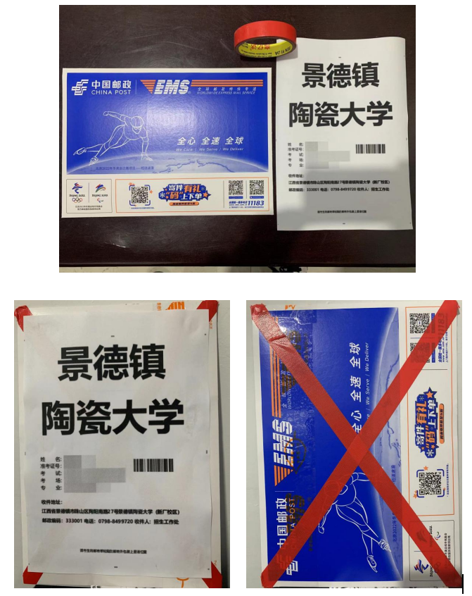 三、邮寄试卷考试当天17:00前,请考生持景德镇陶瓷大学邮寄信息单和密封好的试卷到邮政营业网点进行交寄,一律以邮政EMS特快专递产品邮寄(寄递要求参照当地邮政规范寄递要求),如当天考试场次结束时间较晚,错过邮政集中交寄网点或上门揽收邮件时间,请于次日上午寄出试卷,要求单人单件,不得多名考生试卷合并邮寄,邮寄地址:江西省景德镇市珠山区陶阳南路27号,景德镇陶瓷大学(新厂校区),联系电话:0798-8499720,联系人:招生工作处。请考生将景德镇陶瓷大学邮寄信息单根据邮政网点交寄要求粘贴在邮寄外包装上显著位置。反面粘贴“景德镇陶瓷大学邮寄信息单” 正面粘贴邮件面单