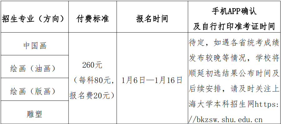 6.录取原则中国画、绘画(油画)、绘画(版画)、雕塑专业投档至上海大学的考生:(1)统考成绩须达到上海大学初选分数线;对应省级统考科类情况详见附件《上海大学上海美术学院2023年艺术类本科专业对应各省统考科类对照表》;(2)校考成绩合格;(3)高考文化成绩须达到生源省份普通类本科第一批次录取控制分数线(实行高考改革合并批次的省份为特殊类型招生控制分数线)的65%;(4)外语单科成绩不低于65分(满分150分);(5)按志愿优先(顺序志愿)原则录取:各专业按校考成绩从高到低排序(全国统一排序),择优录取。如校考成绩相同,学校依次比较素描、色彩、速写单科成绩。新生入学后,学校将根据教育部文件规定进行入学资格复查和专业水平复测工作。复查中发现新生存在弄虚作假、徇私舞弊等情形的,确定为复查不合格,将取消学籍;情节严重的,学校将移交有关部门调查处理。1.学费:每生每学年10000元(沪价行〔2000〕第120号、沪教委财〔2000〕27号)。如有政策变化,则按新政策执行。2.住宿费:每生每学年1200元(不含寒暑假)(沪价费〔2003〕56号、沪财预〔2003〕93号、沪教委财〔2012〕118号)。如有政策变化,则按新政策执行。1.上海大学2023年艺术类专业招生工作在上海市教委、学校党委、本科招生工作领导小组的领导下进行,同时接受上级和学校纪检监察部门的监督检查。2.执行回避制度。参与艺术类专业招生的专家及工作人员须签订承诺书,凡与考生之间有亲属关系、指导关系及其他利害关系的,须在考前主动向学校报告并申请回避。若违反回避制度,学校将按有关规定严肃处理,并列入“黑名单”,终身不得参与高校考试招生工作。3.举报电话:021-36215782(电话接听时间为:工作日8:30—11:00,13:00—16:30)1.严肃处理违法违规行为。学校严格按照《国家教育考试违规处理办法》《普通高等学校招生违规行为处理暂行办法》所确定的程序和规定,对在特殊类型招生考试中违规的考生及有关工作人员从严查处。凡在特殊类型招生考试中有作弊行为的考生,包括冒名顶替、伪造材料骗取报名资格等情况,均应当认定为在国家教育考试中作弊,取消相关考试的报名和录取资格,同时通报省级招生考试机构取消该生当年高考报名和录取资格。作弊行为涉嫌违反《中华人民共和国刑法》规定的,移交司法机关依法处理。2.学校不举办任何形式的考前辅导班,也不对考生和家长作任何形式的承诺。3.学校严禁中介机构参与艺术类专业招生考试工作。4.如因特殊情况影响各专业招考安排,学校将另行发布公告。5.本章程解释权属于上海大学招生与毕业生就业工作办公室。上海大学网址:https://www.shu.edu.cn