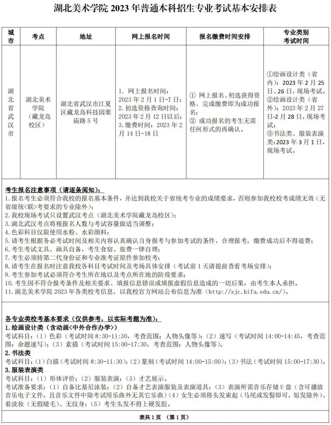 报考造型类、设计类专业的考生,须参加所在省(自治区、直辖市)美术学和设计学类的艺术统考,省统考的具体要求以各省(自治区、直辖市)最终确定的要求为准,通过省统考成绩对报名考生进行初选,初选合格考生方可参加相应类别的校考。考试模式:联考初选+现场复试报名时间:2月1日10:00-2月7日18:00初选结果公布时间:2月12日后缴费确认时间:2月14日10:00-2月18日18:00省外复试时间:2月27日-2月28日考试方式:现场考试考试地点:湖北美术学院藏龙岛校区
