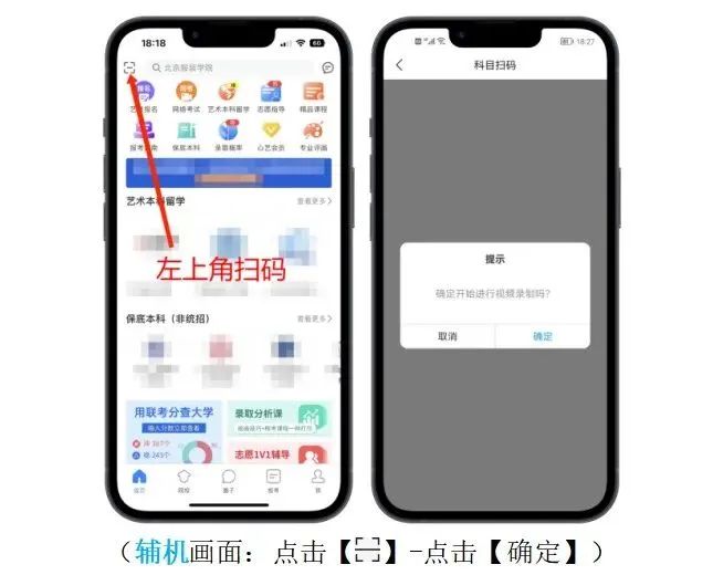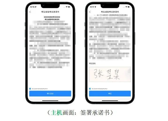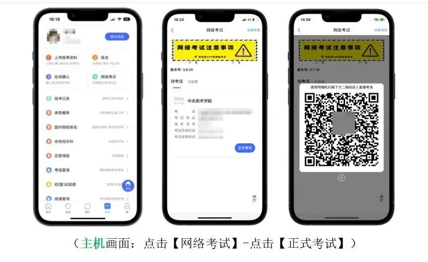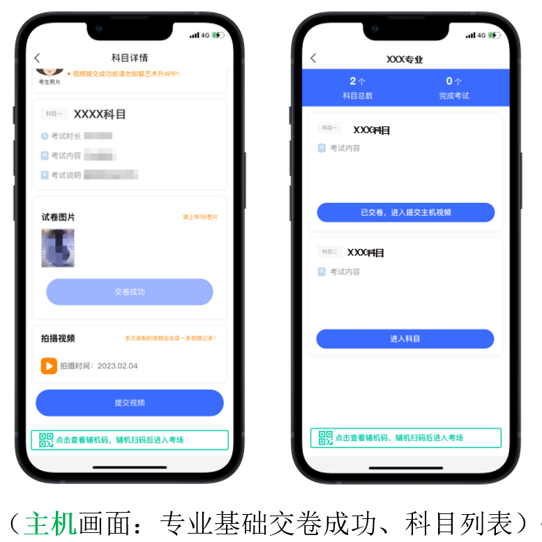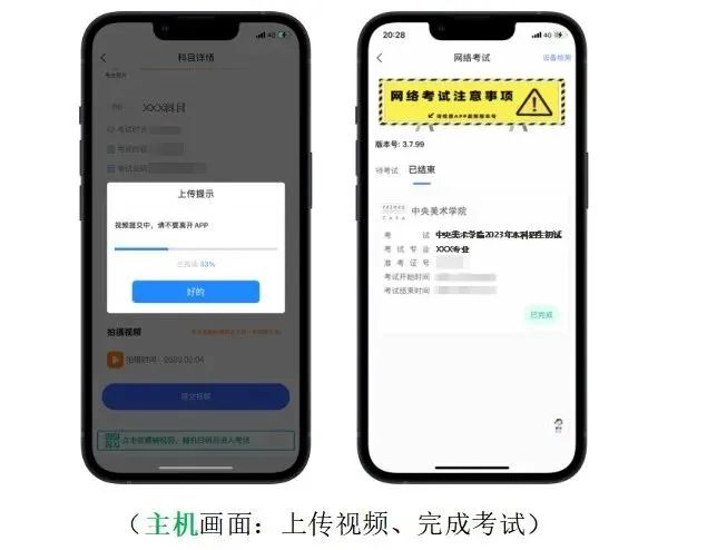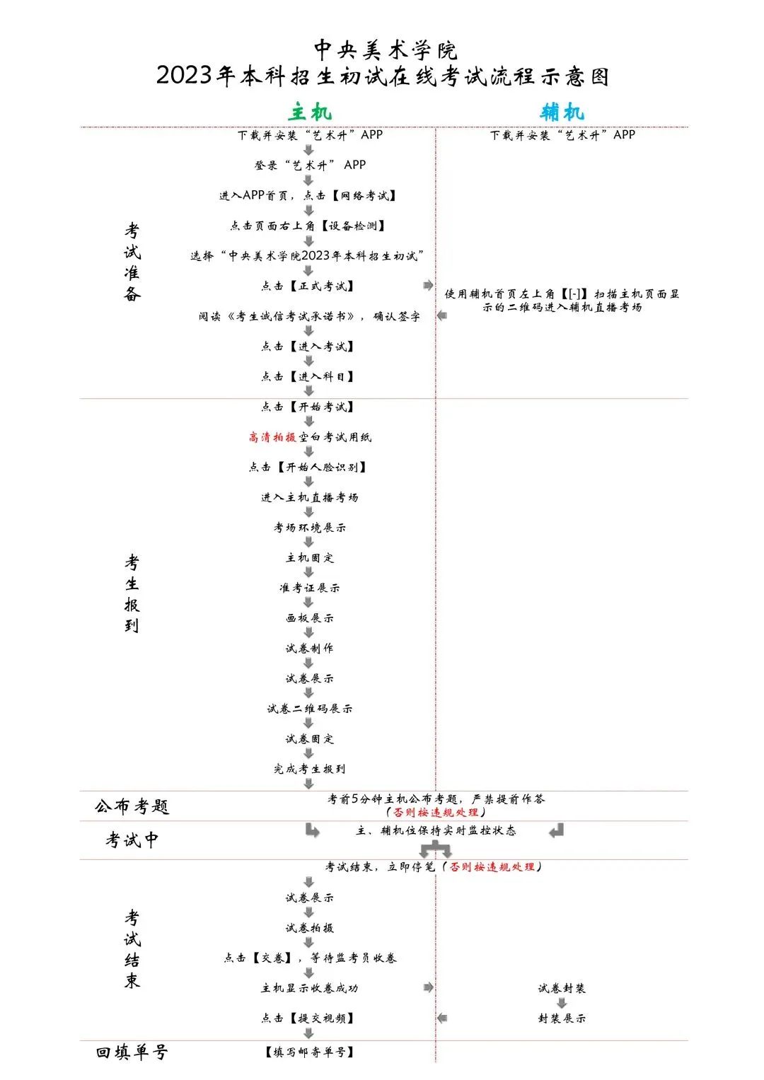2.设备检测:考生在第一次打开“艺术升”APP时,一定要允许应用访问摄像头、麦克风、扬声器、存储空间、网络等权限。对设备的“兼容性、摄像头、拍照、麦克风、扬声器”进行检测,通过检测的手机方可用于参加考前测试和正式考试;兼容性异常或出现部分检测项未通过的手机无法支持考试。3.注意事项:考生在正式考试前务必将两部手机设置为呼叫转移模式,将主、辅机的音量调至最大。退出和关闭所有应用程序,包括但不限于通话、语音、视频、新闻、分屏、录屏、外放音乐、闹钟等可能导致视频录制失败的应用程序。建议完全卸载微信、QQ等APP,确保考试过程中无消息弹窗和电话的接入而导致考试中断。1.主机登录:考生使用主机登录“艺术升”APP,在【首页】或【报考】点击【网络考试】,点击右上角【设备检测】对设备进行【重新检测】(说明:在进行“拍照检测”时,随意拍摄一张照片即可),设备通过检测后选择“中央美术学院2023年本科招生初试”,点击【正式考试】。主机自动弹出二维码供辅机扫码登录使用。2.辅机扫码:使用辅机打开“艺术升”APP(无需登录账号),点击【首页】左上角扫描功能按钮,扫描主机页面显示的二维码直接进入直播考场,将辅机固定在辅机位手机支架上。若辅机未成功进入监控状态,则无法进行考试。辅机正常进入直播考场后,主机自动弹出《考生诚信考试承诺书》,请考生仔细阅读,确认无误,勾选【我已阅读并承诺诚信参加考试】,并在手机上签字确认。考生完成考试承诺书签字确认后,点击【进入考试】,选择应考科目,点击【进入科目】,确认科目详情无误后点击【开始考试】进入直播考场。正式考试当日,考生务必于8:00/13:00准时进入考场,在8:20/13:20前按照语音指令完成考生报到。未听到完整语音指令的考生仍需在答题前按考生报到流程完成规定动作。考生迟到15分钟(8:45/13:45)后不得参加当科考试。考生在辅机视频监控下根据主机画面,按提示框近距离高清拍摄空白考试用纸正、反面,拍摄完成点击【下一步】。考生按照提示点击【开始人脸识别】进行人脸识别。为避免失败,请考生不要佩戴美瞳、化妆等。如果人脸识别未通过,点击【再试一次】重新验证,直至验证通过。验证通过后,进入主机直播考场。