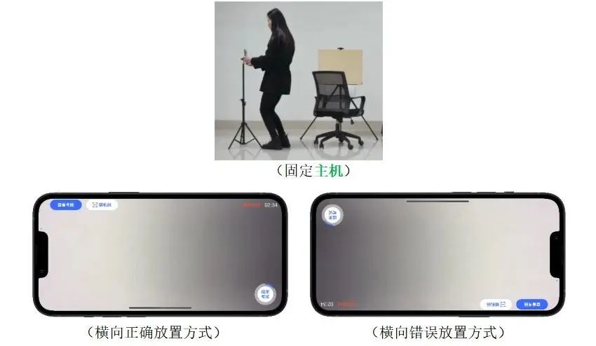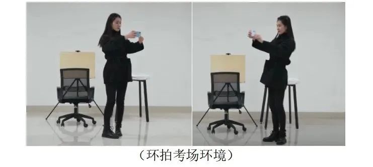 请考生根据语音指令,以答题位置为中心缓慢移动,将主机放置于胸前,360度展示考场环境。再依次展示天花板、地面、画架或桌面。四、主机固定:考生完成考场环境展示后将主机横向固定在主机位手机支架上。请考生面向主机近距离展示准考证正、反面;准考证不得带有任何图案和文字。