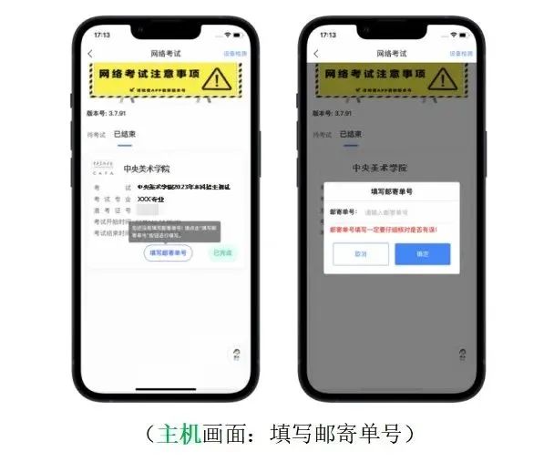 艺术学理论类、建筑类考生主机中的本地视频可在第二场考试结束后按科目逐项提交,务必于考试当日23:00前上传完毕。考生按要求将试卷通过中国邮政特快专递寄出后,登录主机“艺术升”APP,点击【网络考试】,选择对应考试【填写邮寄单号】。确保输入的邮寄单号无误后再点击【确定】。至此,当科考试所有步骤均已完成。一、艺术学理论类:专业基础科目考试结束后,辅机保持监控状态,直接点击主机左上角返回科目列表,选择综合素质考核科目,点击【进入科目】候考,考题在考试开始前5分钟通过主机公布,考生根据题目进行陈述。10分钟考试结束后主机自动结束录制,返回科目详情页【提交视频】。