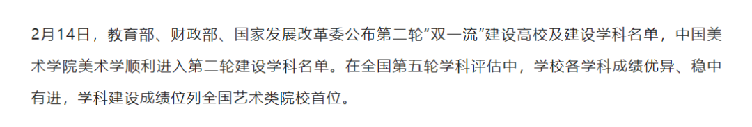汇总17所高校在其官方微信公众号或官网透露了学校在第五轮美术与设计学科评估中取得的成绩,供各位考生及家长参考~1月7日,中国美术学院透露在全国第五轮学科评估中,学校各学科成绩优异、稳中有进,学科建设成绩位列全国艺术类院校首位。