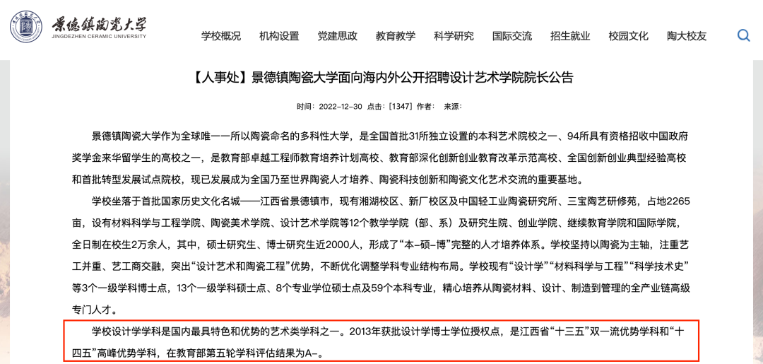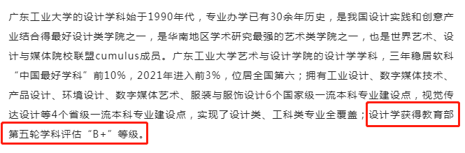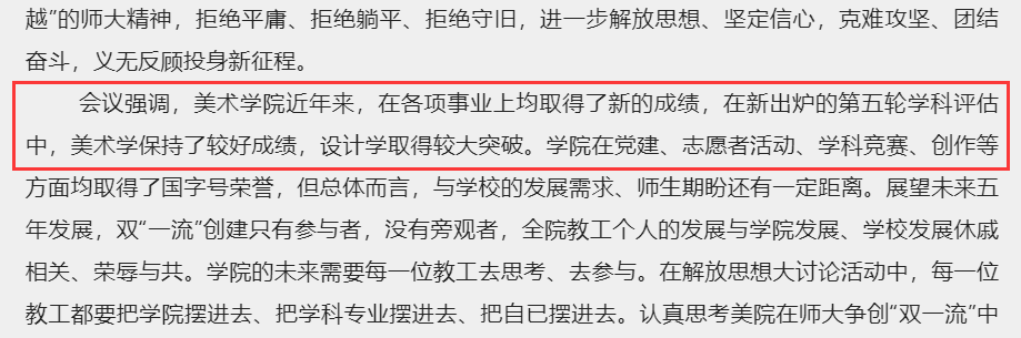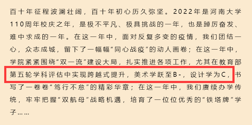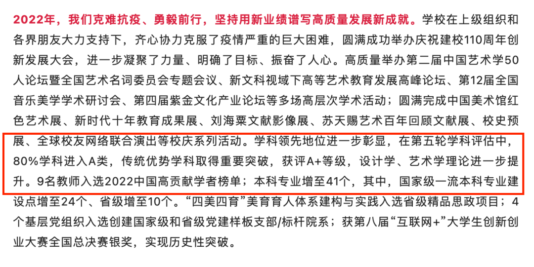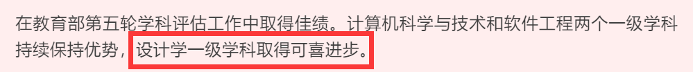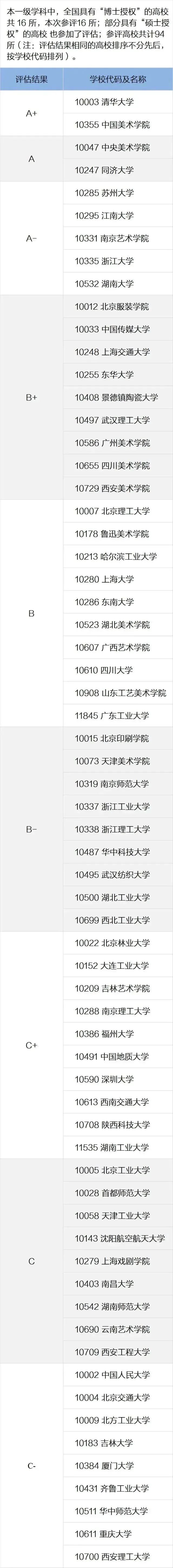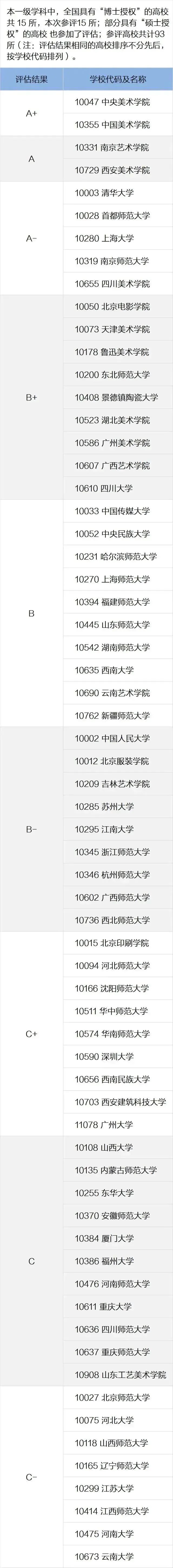 中国美术学院第四轮学科评估结果:美术学A+、设计学A+、艺术学理论A-、戏剧与影视学B+江南大学设计学院在微信公众号上发文,在教育部第五轮学科评估中,江南大学设计学科位列A+,取得历史性突破。1月15日,同济大学副校长、原设计创意学院院长娄永琪教授在同济大学第八届国际青年学者论坛设计学分论坛的校领导致辞环节透露设计学在最新一轮学科评估中取得最高档,即A+。12月30日,景德镇陶瓷大学透露该校设计学科在第五轮学科评估中获得A-。2月12日,广东工业大学艺术与设计学院在官方公众号上透露:设计学获得教育部第五轮学科评估“B+”等级。1月18日,武汉纺织大学艺术与设计学院透露设计学由B-上升到B,完成设计学申博材料的收集与整理。12月31日,四川美术学院透露该校在第五轮学科评估中取得优异成绩,学科建设跃上新台阶。四川美术学院第四轮学科评估结果:美术学A-、设计学B+、艺术学理论C+、戏剧与影视学C12月31日,天津美术学院透露该校设计学、美术学在第五轮学科评估中均有跃升。天津美术学院第四轮学科评估结果:美术学B+、设计学B-12月31日,西安美术学院透露学校在全国第五轮学科评估中保持已有优势,专业学位水平评估取得突出成绩。西安美术学院第四轮学科评估结果:美术学A、设计学B+、艺术学理论B12月31日,南京艺术学院透露该校在教育部第五轮学科评估中,80%学科进入A类,传统优势学科取得重大突破,获评A+等级,设计学、艺术学理论进一步提升。南京艺术学院第四轮学科评估结果:美术学A、音乐与舞蹈学A-、设计学A-、艺术学理论B+、戏剧与影视学B+12月31日,广西艺术学院透露在全国第五轮学科评估中,学校取得较好成绩。广西艺术学院第四轮学科评估结果:美术学B+、音乐与舞蹈学B、设计学B、艺术学理论C+1月13日,浙江大学计算机学院透露学院在教育部第五轮学科评估工作中取得佳绩,计算机科学与技术和软件工程两个一级学科持续保持优势,设计学一级学科取得可喜进步。1月21日,河南大学美术学院透露该校美术学跃升为B-,设计学为C。1月6日,杭州师范大学美术学院透露学院在新出炉的第五轮学科评估中,美术学保持了较好成绩,设计学取得较大突破。杭州师范大学第四轮学科评估结果:艺术学理论B、美术学B-12月31日,陕西科技大学设计与艺术学院透露该校设计学在第五轮学科评估中取得跨越式进步。1月15日,福建师范大学美术学院透露美术学科在2022年软科全国学科排名位列第18名,在第五轮学科评估中稳步上升。1月19日,南通大学艺术学院透露美术学在第五轮学科评估中取得新突破。