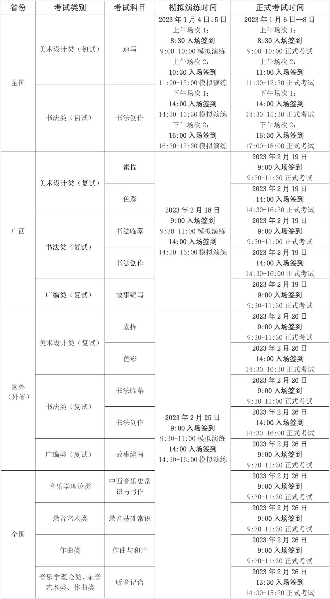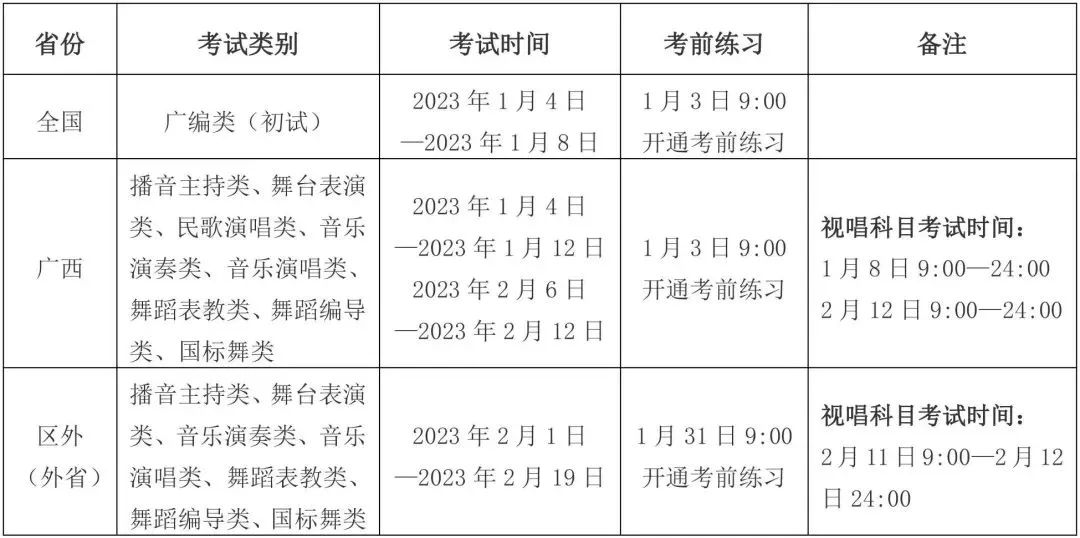 我校将根据实时监考科目的报名人数,以计算机随机方式编排各场次考试,考生具体场次以准考证公布为准。每位考生有两场模拟演练机会,一场为无监考员模拟演练,考生可自行熟悉考试流程、测试考试网络环境;一场为实时监考模拟演练,考生可通过演练规范监考机位架设、熟悉监考员考试指令。建议考生参加两场模拟演练,以保证正式考试的顺利进行。 由于浙江、上海、山东、新疆在1月6日-8日期间有高考或艺术统考,我校已对以上4省(自治区、直辖市)美术设计类、书法类初试时间进行调整或明确,详见《广西艺术学院关于浙江、上海、山东、新疆2023年艺术类本科专业招生考试美术设计类、书法类初试考试时间的通知》。1.了解招生政策:认真阅读《广西艺术学院2023年本科招生专业(方向)、考试内容及要求》、《广西艺术学院2023年艺术类本科专业招生考试考生须知》、《广西艺术学院2023年艺术类本科专业招生考试网络提交视频拍摄要求》、《广西艺术学院2023年艺术类本科专业招生考试示范片》,充分了解广西艺术学院艺术类本科招生相关招考政策和考试要求。