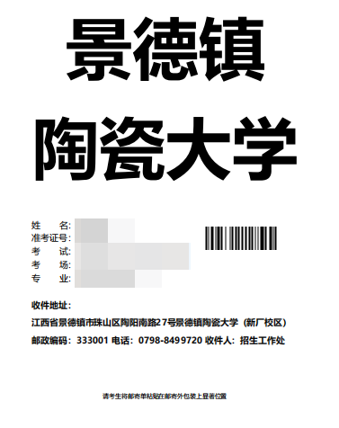 邮寄地址:请考生将景德镇陶瓷大学线上初选考试邮寄信息单粘贴在邮寄外包装上显著位置。详见《附件2:景德镇陶瓷大学2023年美术与设计学类(含书法学)专业校考线上初选网络考试试卷封装及邮寄要求》