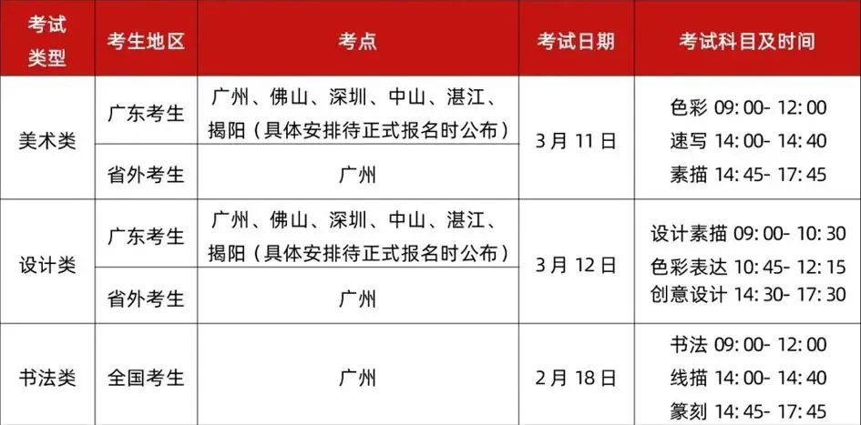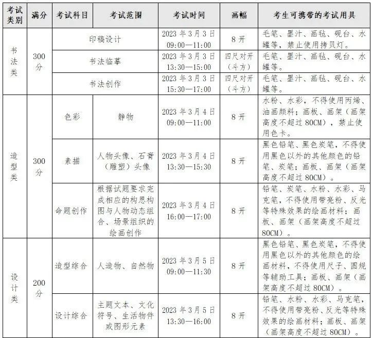 考试时间:2023年2月9日素描8:30-10:00,色彩10:45-12:15,设计基础14:30-16:30