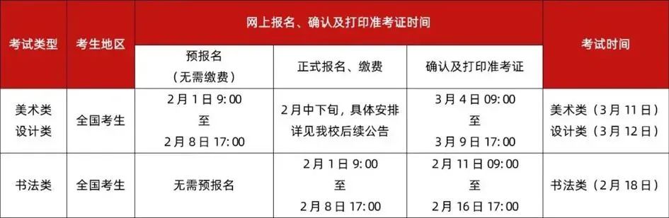 报考造型类、设计类专业的考生,须参加所在省(自治区、直辖市)美术学和设计学类的艺术统考,省统考的具体要求以各省(自治区、直辖市)最终确定的要求为准,通过省统考成绩对报名考生进行初选,初选合格考生方可参加相应类别的校考。考试模式:联考初选+现场复试报名时间:2月1日10:00-2月7日18:00初选结果公布时间:2月12日后缴费确认时间:2月14日10:00-2月18日18:00省外复试时间:2月27日-2月28日考试方式:现场考试考试地点:湖北美术学院藏龙岛校区