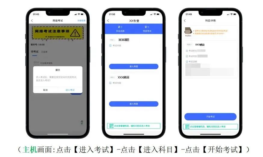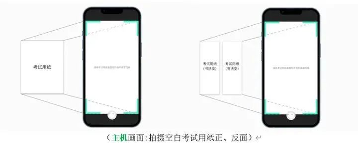 2.设备检测:考生在第一次打开“艺术升”APP时,一定要允许应用访问摄像头、麦克风、扬声器、存储空间、网络等权限。对设备的“兼容性、摄像头、拍照、麦克风、扬声器”进行检测,通过检测的手机方可用于参加考前测试和正式考试;兼容性异常或出现部分检测项未通过的手机无法支持考试。3.注意事项:考生在正式考试前务必将两部手机设置为呼叫转移模式,将主、辅机的音量调至最大。退出和关闭所有应用程序,包括但不限于通话、语音、视频、新闻、分屏、录屏、外放音乐、闹钟等可能导致视频录制失败的应用程序。建议完全卸载微信、QQ等APP,确保考试过程中无消息弹窗和电话的接入而导致考试中断。1.主机登录:考生使用主机登录“艺术升”APP,在【首页】或【报考】点击【网络考试】,点击右上角【设备检测】对设备进行【重新检测】(说明:在进行“拍照检测”时,随意拍摄一张照片即可),设备通过检测后选择“中央美术学院2023年本科招生初试”,点击【正式考试】。主机自动弹出二维码供辅机扫码登录使用。2.辅机扫码:使用辅机打开“艺术升”APP(无需登录账号),点击【首页】左上角扫描功能按钮,扫描主机页面显示的二维码直接进入直播考场,将辅机固定在辅机位手机支架上。若辅机未成功进入监控状态,则无法进行考试。辅机正常进入直播考场后,主机自动弹出《考生诚信考试承诺书》,请考生仔细阅读,确认无误,勾选【我已阅读并承诺诚信参加考试】,并在手机上签字确认。考生完成考试承诺书签字确认后,点击【进入考试】,选择应考科目,点击【进入科目】,确认科目详情无误后点击【开始考试】进入直播考场。正式考试当日,考生务必于8:00/13:00准时进入考场,在8:20/13:20前按照语音指令完成考生报到。未听到完整语音指令的考生仍需在答题前按考生报到流程完成规定动作。考生迟到15分钟(8:45/13:45)后不得参加当科考试。考生在辅机视频监控下根据主机画面,按提示框近距离高清拍摄空白考试用纸正、反面,拍摄完成点击【下一步】。考生按照提示点击【开始人脸识别】进行人脸识别。为避免失败,请考生不要佩戴美瞳、化妆等。如果人脸识别未通过,点击【再试一次】重新验证,直至验证通过。验证通过后,进入主机直播考场。