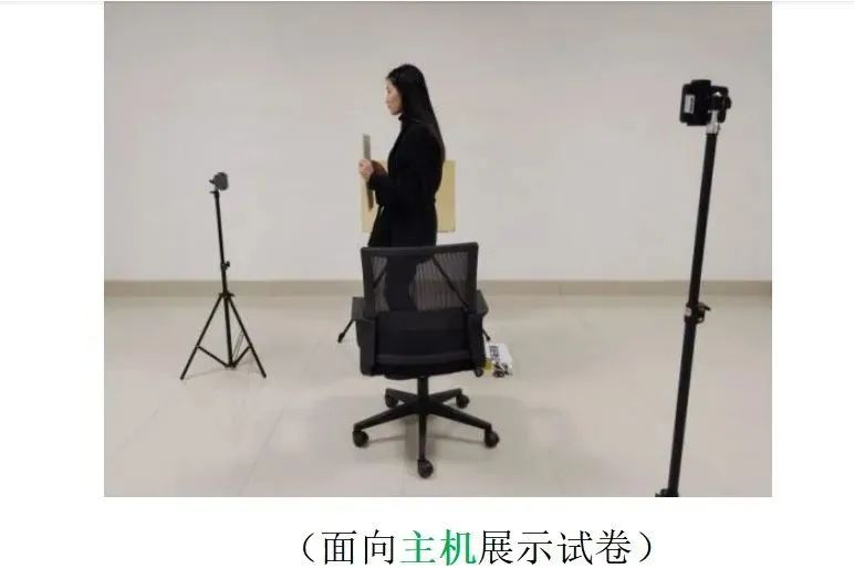 请考生根据语音指令,以答题位置为中心缓慢移动,将主机放置于胸前,360度展示考场环境。再依次展示天花板、地面、画架或桌面。四、主机固定:考生完成考场环境展示后将主机横向固定在主机位手机支架上。请考生面向主机近距离展示准考证正、反面;准考证不得带有任何图案和文字。