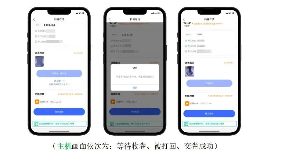 考试结束,考生须立即停止作答,否则按违规处理。根据语音指令,面向主机进行试卷展示。书法学专业考生依次展示2张试卷。试卷展示后不得再进行修改。1.试卷展示完成后,考生取下主机,高清拍摄试卷,确保试卷照片完整、清晰,画面中避免出现除试卷外的环境及物品。点击【交卷】,等待监考员收卷。书法学专业考生交卷时,将两张试卷并排摆放后拍照提交。2.请考生关注收卷状态,试卷照片不完整或不清晰将会被监考员打回,考生须重新拍摄,重新点击【交卷】,直至交卷成功。交卷过程须在辅机监控下进行。1.书法类:考试结束,考生依次展示2张试卷,将试卷和草稿纸一并放入硬纸板,装入1个试卷包装袋密封。